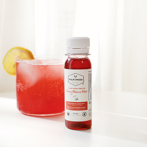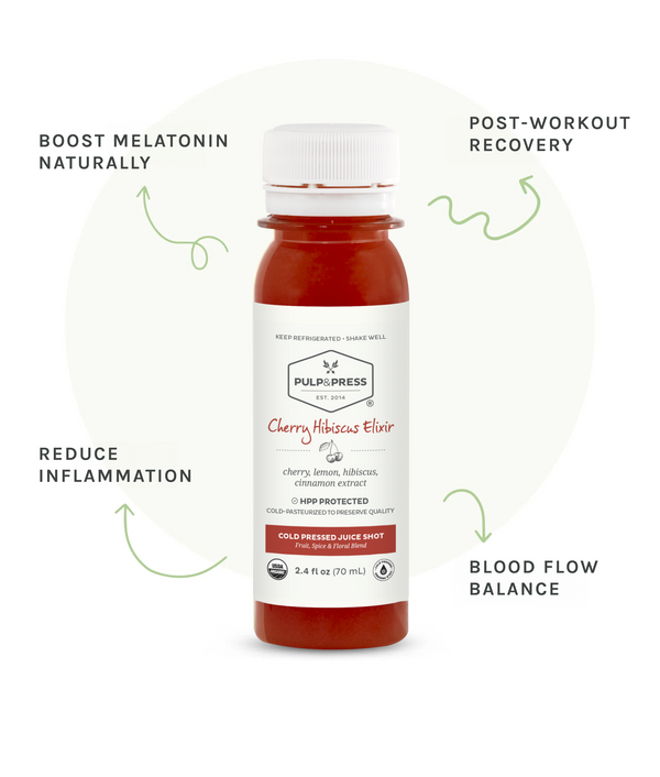 Introducing our Cherry Hibiscus Elixir, a potent superfood elixir inspired by our new Tart Cherry Juice. Crafted to seamlessly integrate into your daily routine, this elixir brings the benefits of tart cherry to your pocket. Enhance melatonin levels for restful nights and harness the anti-inflammatory properties of tart cherries and hibiscus. Whether enjoyed as a sleepy girl mocktail or aiding in post-workout recovery, it's your perfect companion for balanced wellness.