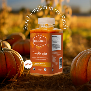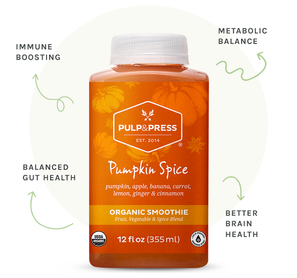 BACK FOR A LIMITED TIME, your perfect cozy companion for fall, this Pumpkin Spice Smoothie is our healthy take on the infamous PSL. Crafted from 100% organic ingredients, it has the natural goodness of REAL pumpkin — no concentrates or added sugars here. With ingredients like banana, apple, and carrot, plus a kick of cinnamon and ginger, this seasonal smoothie is packed with pre-biotics, fiber, and vitamins.